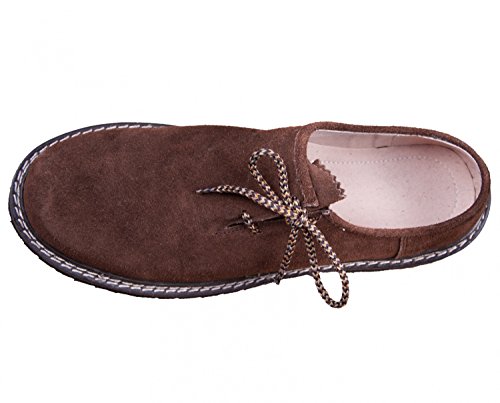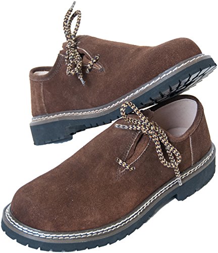 Herren Trachten Schuh der Marke AlmwerkTraditioneller Schuh in den Farben braun, dunkelbraun, hellbraun, schwarz und schwarz mit weißer Naht. Aus echtem Wildleder gefertigt mit einer Sohle aus Gummi.Garantierter Halt bei feuchtem Wetter und Untergrund. Details:Seitliche Schnürung durch die er sich an den Fuß anpassen lässt. Die Doppelnaht garantiert hochwertige Verarbeitung und Langlebigkeit.Angenehmes (herausnehmbares) Fußbett für einen hohen Tragekomfort. Mit diesem bequemen Schuh können Sie lange und bequem Feste feiern, auf der Bank tanzen bzw. das Tanzbein schwingen.Er passt nicht nur zur Ihrem Trachtenoutfit sondern Sie können Ihn dank seiner schlichten, modernen Eleganz vielseitig kombinieren. Zum Beispiel im Altag mit einer Jeans.In unserem Amazon Shop haben wir noch weitere Produkte, die Ihnen gefallen könnten. Schauen Sie einfach vorbei, indem Sie auf unseren Namen klicken.Wir wünschen Ihnen viel Freude mit den Produkten der Firma AlmwerkBitte beachten Sie, dass es sich hierbei um ein Naturprodukt handelt und somit der Farbton etwas abweichen kann.